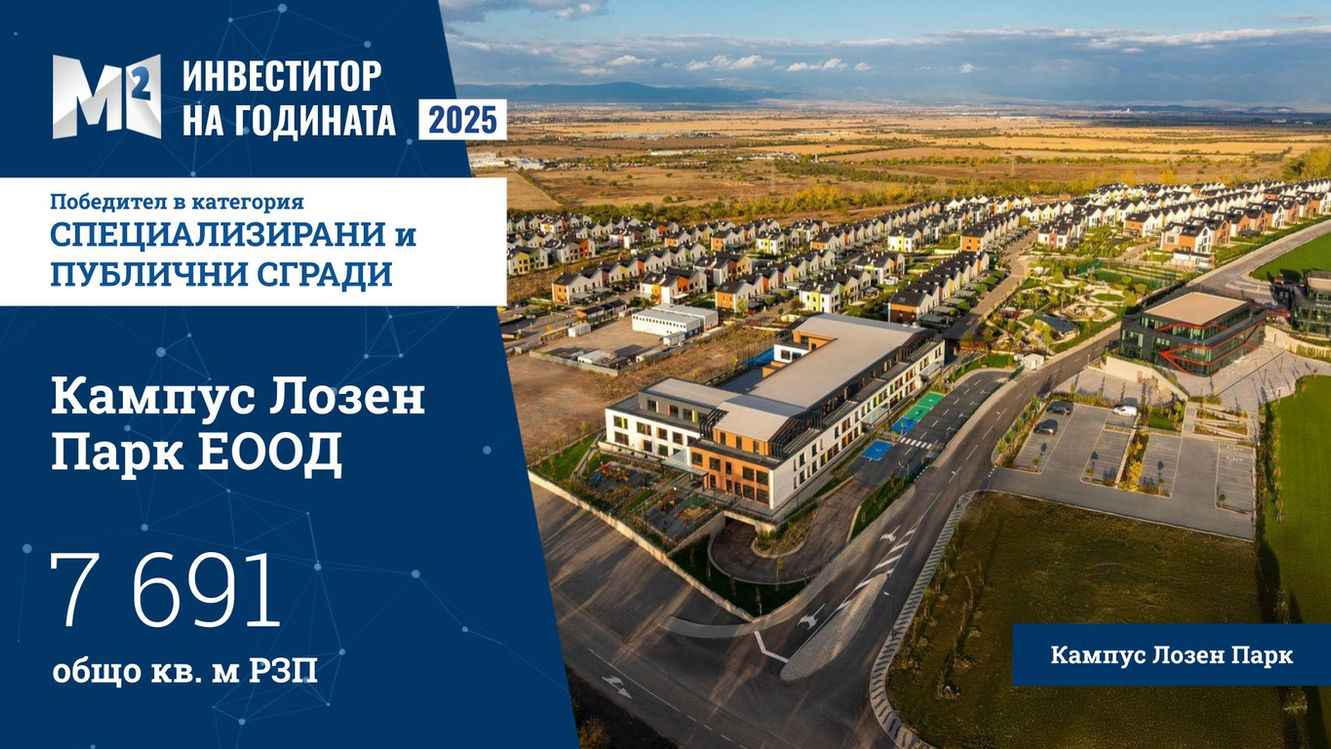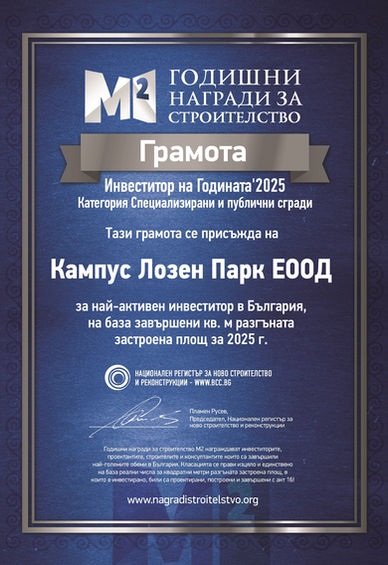 Campus Lozen Park EOOD was honored at the M2 Annual Construction Awards with the Investor of the Year ’25 award in the Specialized and Public Buildings Category. The award is presented to the most active investor in Bulgaria based on completed square meters of developed built-up area for 2025. The official award ceremony took place on 09.12.2025.